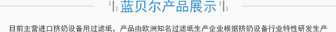 濟南藍貝爾工貿(mào)有限公司主要產(chǎn)品擠奶設(shè)備過濾紙,牛奶過濾紙,擠奶機過濾袋,目前主營進口擠奶設(shè)備用過濾紙,產(chǎn)品由歐洲知名過濾紙生產(chǎn)企業(yè)根據(jù)擠奶設(shè)備行業(yè)特性研發(fā)生產(chǎn),產(chǎn)品符合歐盟食品接觸標準及FDA食品接觸標準,產(chǎn)品在擠奶設(shè)備過濾紙行業(yè)占有70%以上的份額。并通過了SGS標準技術(shù)檢測中心按國標食品級標準進行的檢測。產(chǎn)品適用于各種擠奶設(shè)備品牌,本公司目前獲得該區(qū)域產(chǎn)品營銷資格。產(chǎn)品已用于國內(nèi)各大乳企所屬牧...
